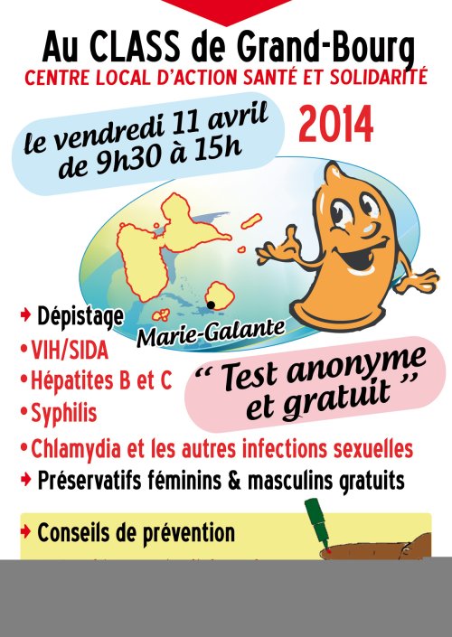 Avril 2014Nous vous informons que le CIDDIST (Centre d’Information de Dépistage et de Diagnostic des Infections Sexuellement Transmissibles) du CHU de Pointe-à-Pitre en collaboration avec le CLASS de Grand Bourg animera une journée de prévention et de dépistage du VIH/Sida, hépatites B et C, Syphilis, Chlamydia et les autres infections sexuelles le vendredi 11 avril 2014 de 9h30 à 15h au CLASS de Grand Bourg de MARIE GALANTE.