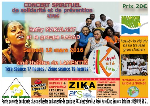 Mars 2016Le samedi 19 mars 2016 au ciné théâtre du LAMENTIN se tiendra le concert de Betty MAROLANY. Venez y nombreux.