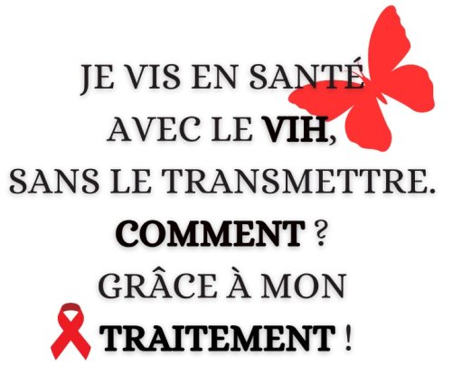 Message local : "Je vis en santé avec le VIH, sans le transmettre. Comment ? Grâce à mon traitement !"